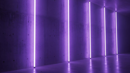 A minimalist concrete interior is dramatically illuminated by a series of vertical purple neon lights. The stark, textured walls and floor of the space are bathed in the vibrant, electric glow, creating a futuristic and atmospheric ambiance. The clean lines and geometric simplicity of the architecture are accentuated by the glowing light tubes, casting reflections on the polished floor.
