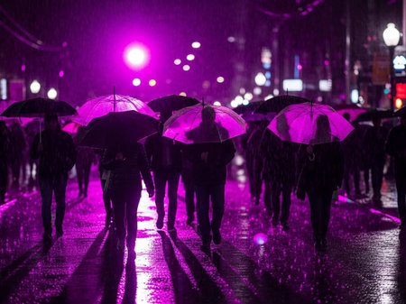 Crowd of people with umbrellas at night in the rain