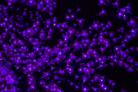 Night, street decoration, festive background. The branches of the tree are decorated with a garland. Violet lights, flicker, glare. It's all blurry.