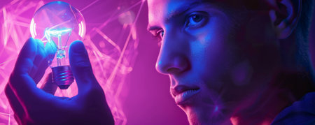 A young man holding a light bulb that emits a cool blue light, isolated on a dark purple studio background. The contrast creates a dramatic effect.