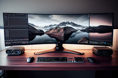 sleek and modern desk with ultrawide monitor, keyboard, and mouse, created with generative ai