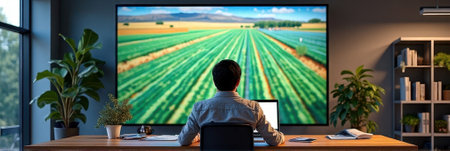 Young asian male analyzing agricultural data on large screen in modern office. That the image is generated using AI.
