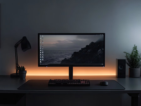 Computer desk setup with a minimalist design, clean layout, keyboard, and monitor neatly arranged