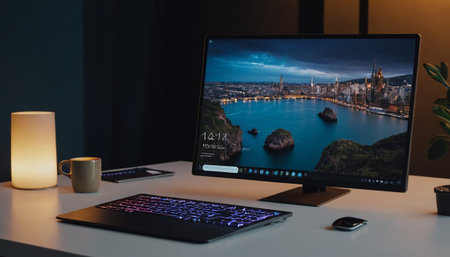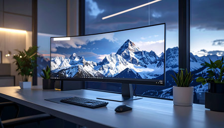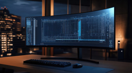 A sleek modern workspace featuring a curved monitor displaying intricate data analysis. The scene captures the essence of technology and productivity against a city skyline backdrop at night.