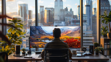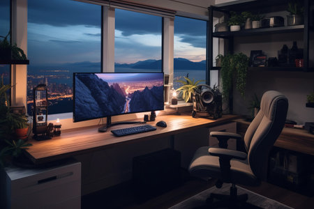 Home Office with Plants and Nature-Inspired Decor. A bright home office space filled with lush green plants, a nature-themed desktop wallpaper, creating a refreshing work environment.