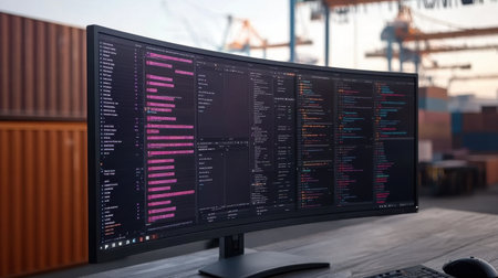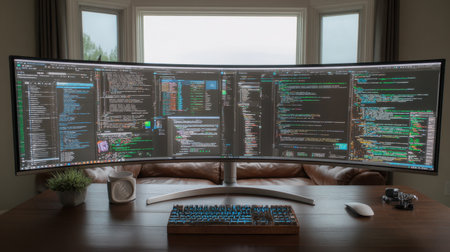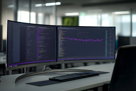 Dual curved monitors displaying code and data analytics in a dimly lit office environment.