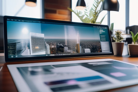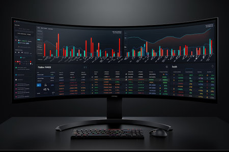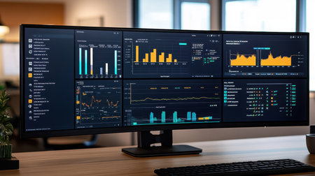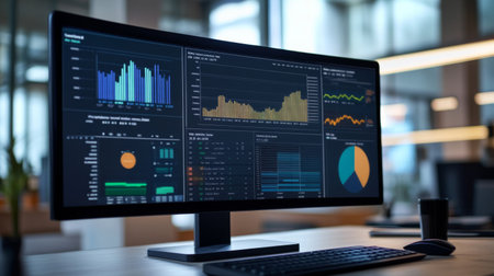 big widescreen monitor with charts and management dashboard in front of office desk professional photography