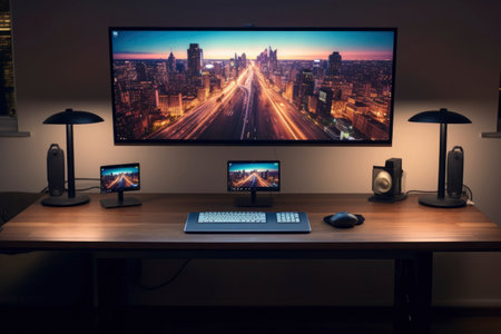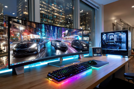 Inviting image of a stylish modern workspace featuring multiple monitors, colorful keyboard, and an inspiring ambiance, perfect for productivity and creativity.