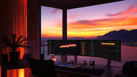 A sleek desk showcases a wide monitor and a keyboard, while a beautiful gradient sky in soft colors enhances the peaceful ambiance at dusk.