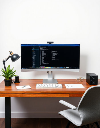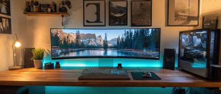Innovative tech workspace with curved ultrawide monitor, ambient RGB lighting, and neatly arranged productivity setup