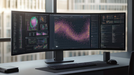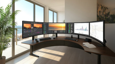A sleek office space featuring multiple curved monitors displaying vibrant data visualizations. Ideal for technology and finance professionals seeking inspiration and efficiency.
