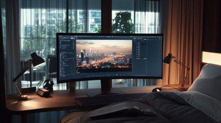 Shot of a Desktop Computer in the Modern Office with Monitor Showing Photo Editing Software. In the Background Warm Evening Lighting and Open Space Studio with City Window View