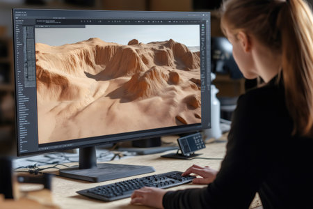 Woman working on a 3D model of Mars surface, developing a realistic Martian environment on her computer