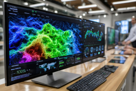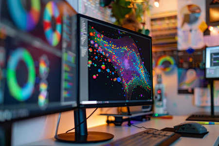 Bright and vibrant data visualizations fill the screen of a sleek computer in a contemporary office setting.
