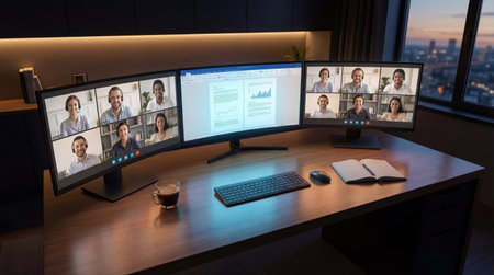 Modern home office desk featuring three screens with video calls and charts at night. Ideal for remote work, business technology, and productivity concepts.