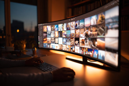 Individual is engaged with a large curved monitor displaying a collage of colorful images in a stylish workspace, illuminated by warm light, creating a comfortable and inviting atmosphere
