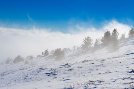 Beautiful winter landscape in the Crimean Mountains. Fir trees covered with snow. 12/27/2008