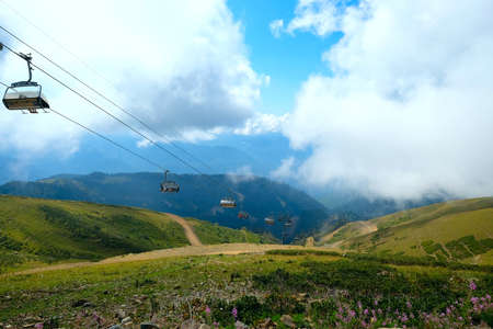 Krasnaya Polyana, Sochi, Krasnodar territory 16.09.20 top of the Caucasus mountains cable car between gorges . Autumn weather is cloudy in the mountains