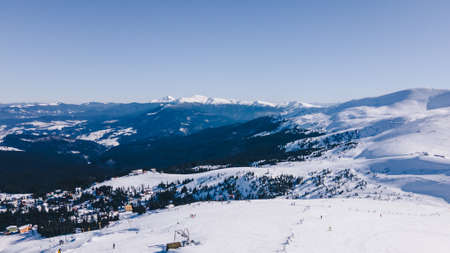 Beautiful landscape of the Arkhyz ski resort with mountains, rorest, snow and a cable car on a sunny winter day. Caucasus Mountains, Russia.