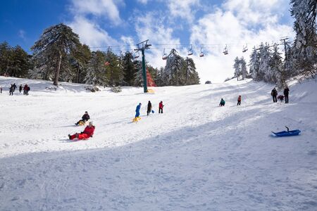 Troodos, Cyprus- January 12, 2019 - People at ski lift resort on the mountain range.