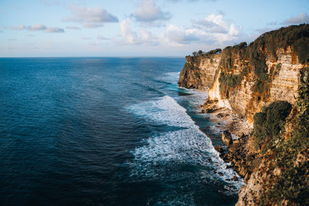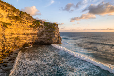 Indian ocean with waves and cliff in Uluwatu, Bali with sunset light