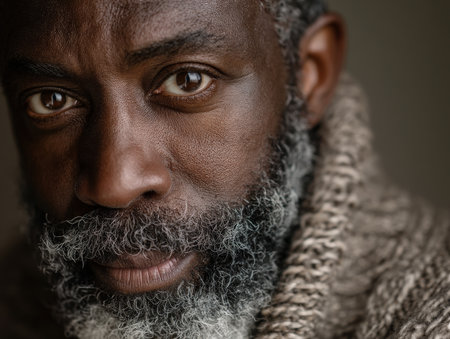 Elderly man with a thoughtful expression, detailed features, and a gray beard, wearing a textured sweater, fills the frame with focus on eyes and facial texture, capturing depth and emotion