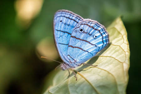 Lobelia Blue Ringlet butterfly Caeruleuptychia lobelia perching on a leaf in Manu National Park, Peru