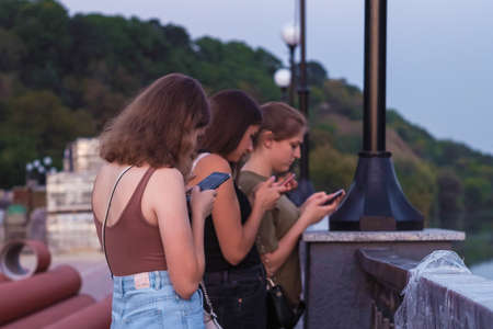 Zhytomyr, Ukraine - September 1, 2020: Three girls using their phones at the river bank. People stop communicating each other live, concept