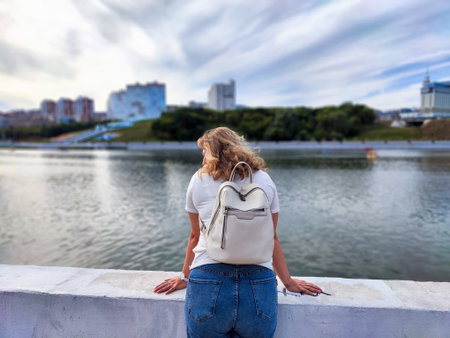 Beautiful European young woman traveler in jeans clothes sits on the parapet and enjoys the views of Moscow. Vrorbievy Gory, view of the Moscow City business center and the Luzhniki Stadium