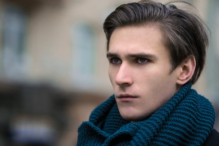 Young adult man sitting calmly and looking into the distance with a troubled look. Close headshot