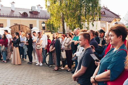 May 25, 2019 Minsk Belarus Street festivities in the evening city People stand in the street at a concert.
