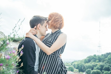 Teenagers in love sit on park bench, resting in the rays of autumn sun, boy looking straight ahead. Concept of teen love