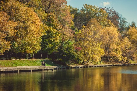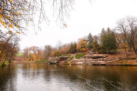 A dam in an old abandoned autumn park. Bright sunny autumn landscape with fallen maple leaves.