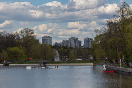 MOSCOW, RUSSIA - May 07, 2021: View to the Kamensky pond at ENEA (VDNH) during spring.