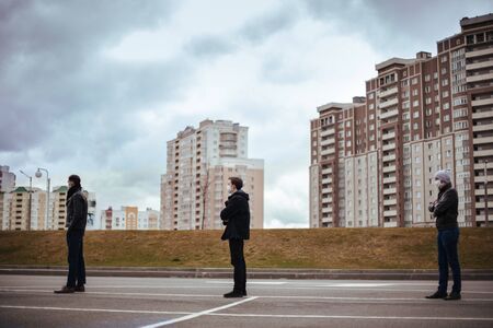 BISHKEK, KYRGYZ REPUBLIC - APRIL 14, 2018: Selfie time. Handsome friends making selfie and smiling while resting at street music festival.