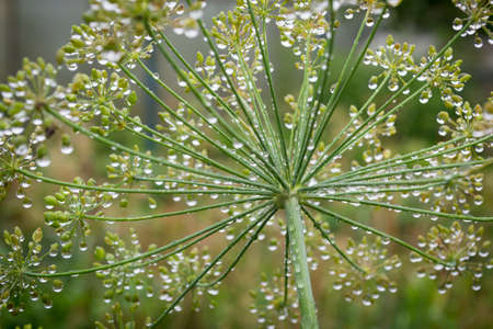 dill umbrella in the summer garden. closeup of a dill umbrella with dew drops