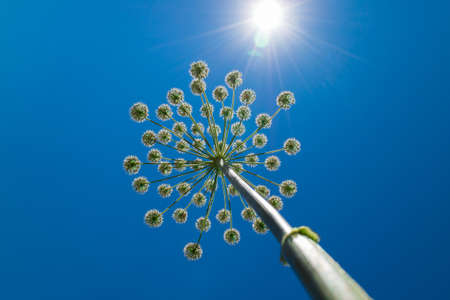 Large hogweed towards the sun, bottom view. Dangerous plant