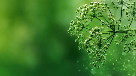 This image shows a macro texture view of delicate lacy flower blossoms on s parsley herb plant, with defocused background and copy space.