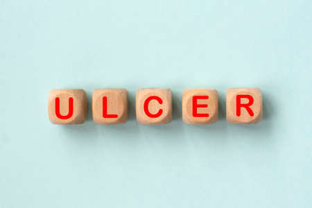 Stomach ulcer symbol. Wooden cubes with the word 'ulcer'. Beautiful white table, white background. Medical and stomach ulcer concept. Copy space.