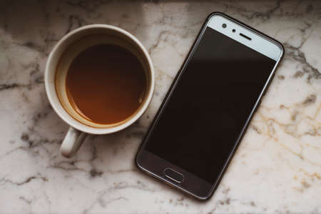 A smartphone with a white blank screen lies in a hand on a dark background. Copy space