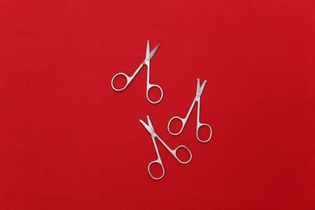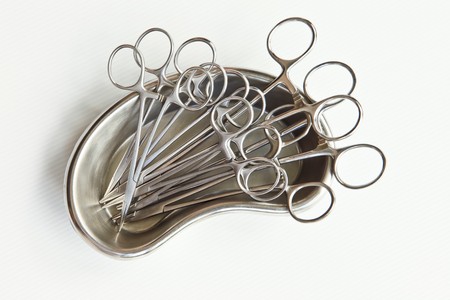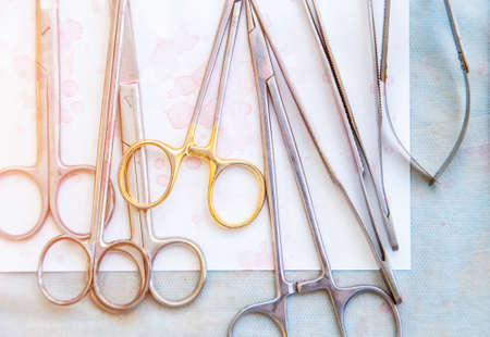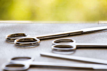 Scissors prepare for surgical instruments during operation, scissors, forceps and scalpels, Straight scissor used to cut suture material where as curve scissor for tissue. concept of surgery preparation