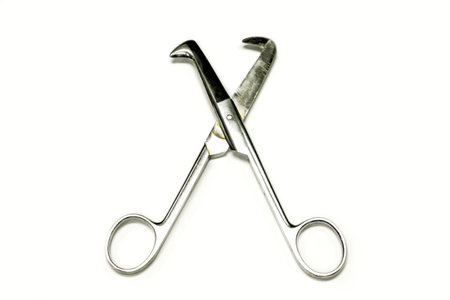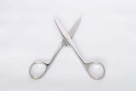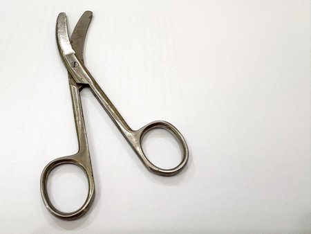 Close-up of medical scissors isolated on a white background. Stainless steel surgical instrument used in hospitals or clinics for cutting tissues or bandages
