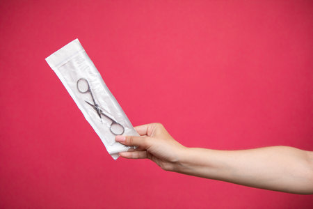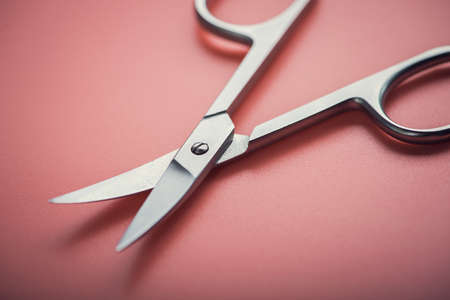 Woman hand holding nail scissors for manicure on pink background. Tool for beauty procedure. Hygiene and care concept. High quality photo