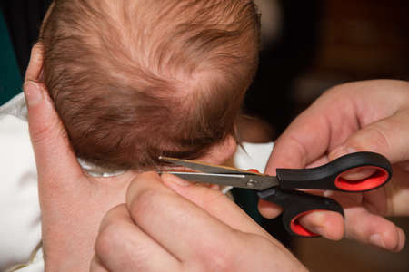 Cut off the hair from the baptism ceremony. Candle and hair as detail from baptism in Romania