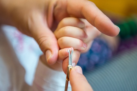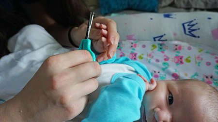 A newborn childs nails are cut with special baby scissors. An adult hand holds a small childs hand. Carefully, the mother cuts her daughters nails. A child in a cocoon, home environment. Trust.