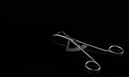 Dental caliper on black background. This instrument has calibrated scale and is used to measure the size of teeth. Closeup
