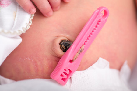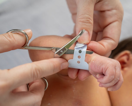 A woman cuts a tag from a newborn boys hand with nail scissors. Close-up of hands