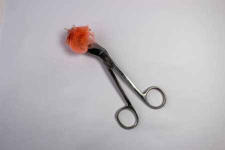 Scissors surgical with torundas in an operating theater, composition horizontal, conceptual image