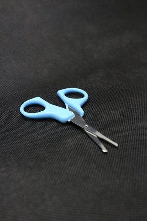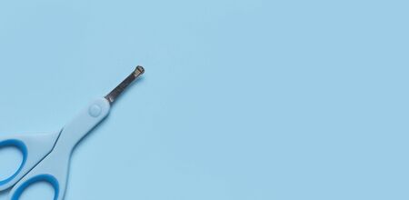 Baby blue scissors for hygiene on blue background top view flat lay copy space. Metal and plastic baby nail scissors. Manicure scissors. Baby care concept. Cosmetic accessory for boy.