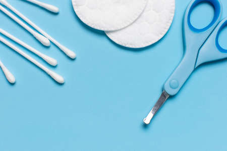 Baby blue scissors, cotton sponges swabs buds on blue background top view flat lay copy space. Cosmetic accessories for children hygiene. Manicure scissors. baby care concept.